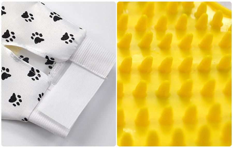 Construction: The pet grooming gloves are made of breathable and comfortable fabric. The wrist part has elastic fixing straps. Some of them have hanging ropes and the edges are edge-wrapped. They are gentle on the pet during grooming, and the wearing is stable and durable.